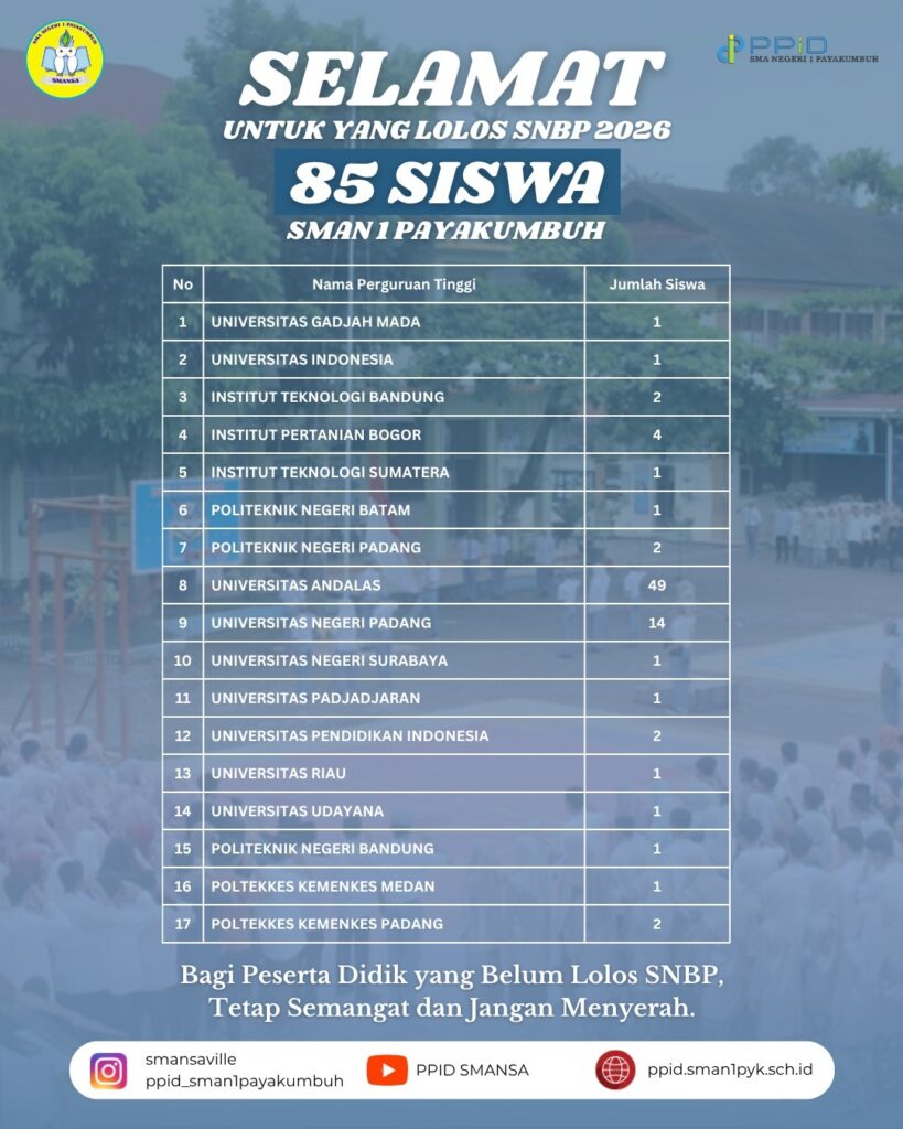 Payakumbuh, 31 Maret 2026 — Kabar membanggakan datang dari SMAN 1 Payakumbuh. Pada pengumuman hasil Seleksi Nasional Berdasarkan Prestasi (SNBP) Tahun 2026 yang dirilis pada Selasa, 31 Maret 2026 pukul 15.00 WIB, sebanyak 85 orang siswa SMAN 1 Payakumbuh dinyatakan berhasil lolos ke berbagai perguruan tinggi negeri ternama di Indonesia.